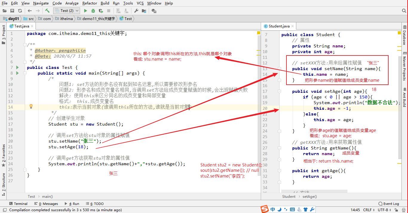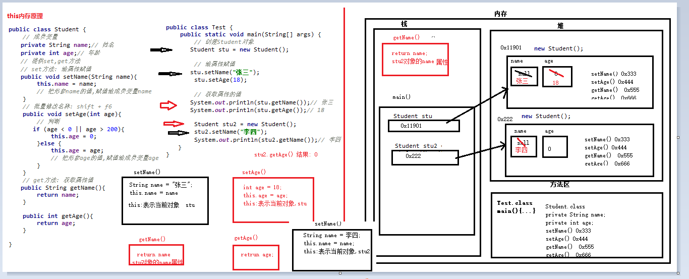 setXxx()的形参变量名后,方法并没有给成员变量赋值!这是由于形参变量名与成员变量名重名,导致成员变量名被隐藏,方法中的变量名,无法访问到成员变量,从而赋值失败。所以,我们只能使用this关键字,来解决这个重名问题。