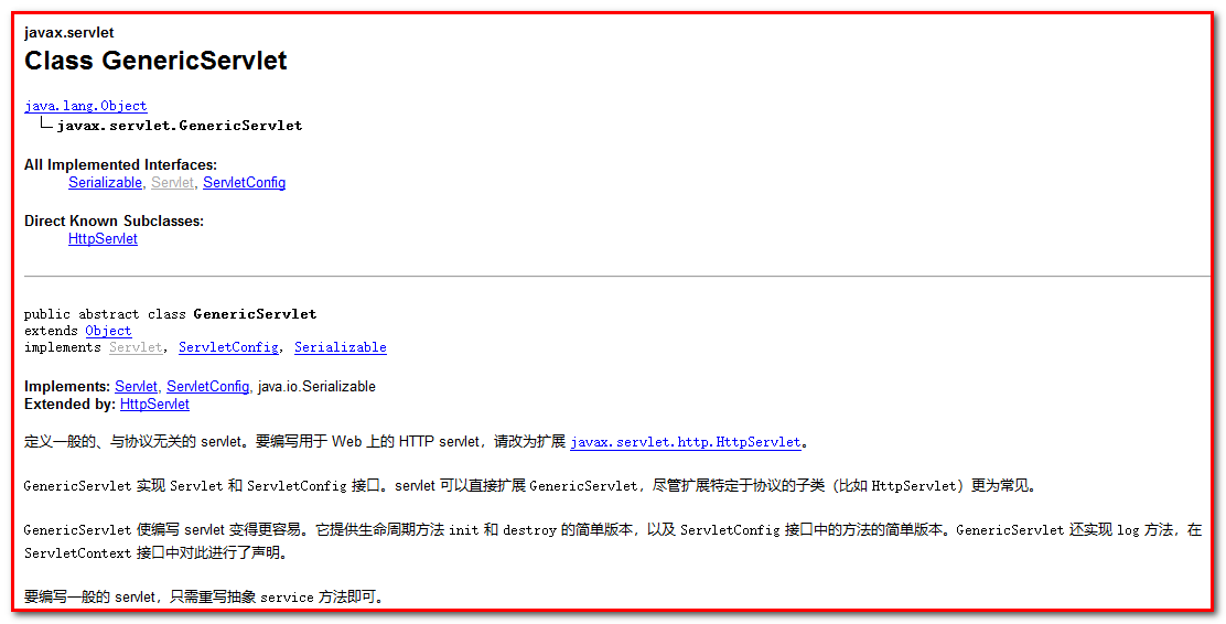 阅读上图API可知,GenericServlet 是一个类,它简化了servlet的开发,已经提供好了一些servlet接口所需的方法,我们开发者只需要重写service方法即可