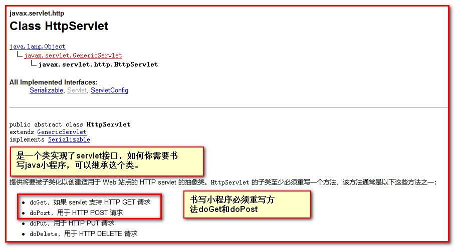 通过以上两个API阅读,同学们注意一个细节HttpServlet是GenericServlet的子类,它增强了GenericServlet一些功能,因此,在后期使用的时候,我们都是选择继承HttpServlet来开发servlet程序。