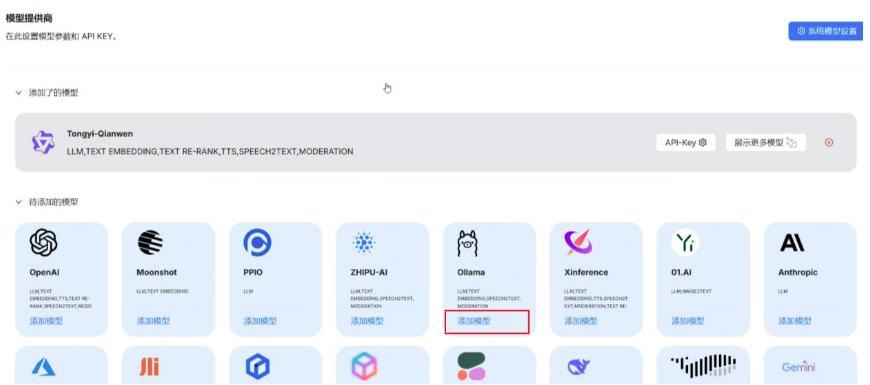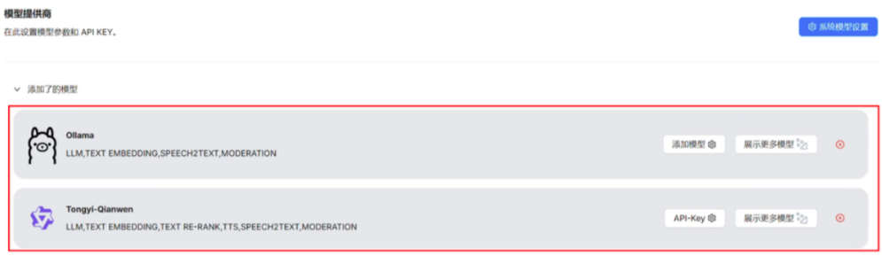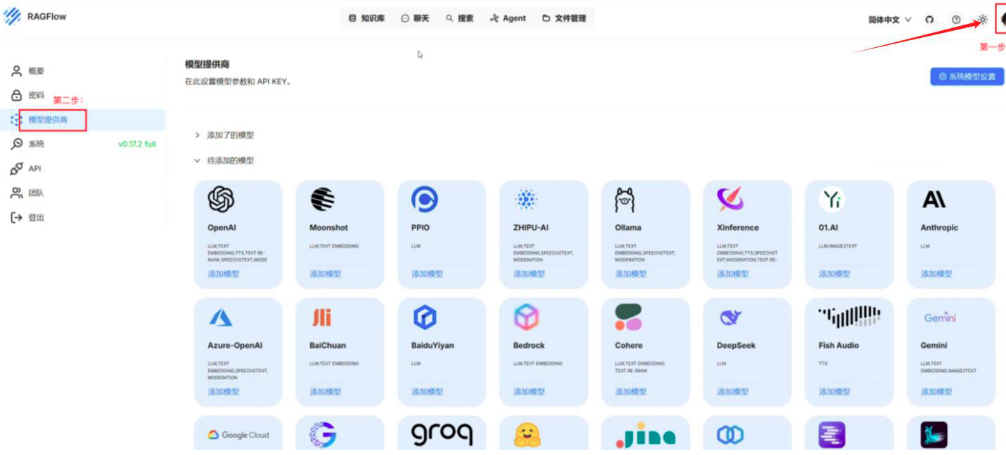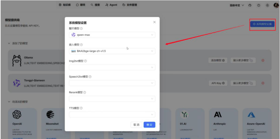- 缺省模型配置:上面的模型配置仅是告知RAGFlow有哪些模型可用,一般来说还需要配置一个系统模型