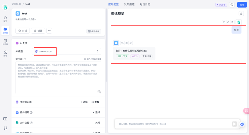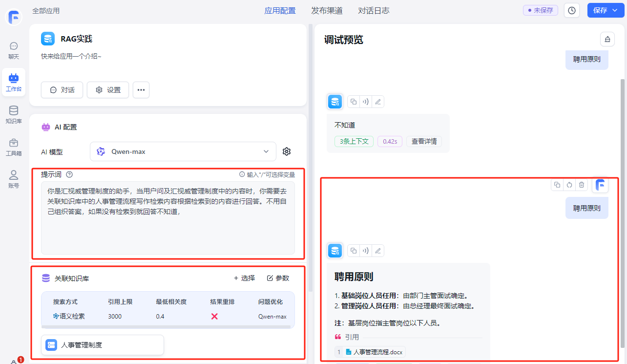 创建应用、添加知识库、定义提示词后,一个基于RAG的大模型应用就做好了